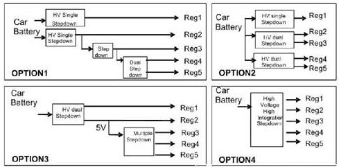 這里列出了四種常用的電源架構(gòu),總結(jié)了最近三年汽車(chē)領(lǐng)域的典型設(shè)計(jì)架構(gòu)。當(dāng)然,用戶(hù)可以通過(guò)不同方式實(shí)現(xiàn)具體的設(shè)計(jì)要求,多數(shù)方案可歸納為這四種結(jié)構(gòu)中的一種。