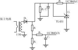 電壓反饋電路如圖3所示,輸出電壓通過集成穩(wěn)壓器TL431和光耦反饋到UC3843(1)腳,調節(jié)R1、R2分壓比可設定和調節(jié)輸出電壓,達到較高的穩(wěn)壓精度。如果輸出電壓Uo升高,集成穩(wěn)壓器TL431陰極到陽極的電流增大,使光耦輸出三極管電流增大即UC3843(1)腳對地的分流變大,UC3843輸出脈寬相應變窄,輸出電壓Uo減小。同樣地,如果輸出電壓Uo減小,可通過反饋調節(jié)使之升高。