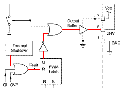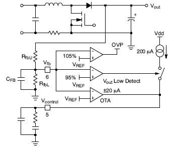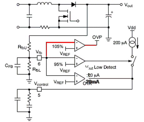 2. 快速瞬態(tài)響應/過壓保護(OVP):當VFB > 105% VPREF時,過壓保護激活,驅(qū)動器輸出變?yōu)榈碗娖?;當VFB低于103.2% VPREF時,器件自動恢復工作。