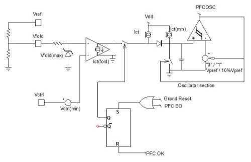 VCTRL與功率及頻率的關(guān)系:當輸出功率下降時,VCTRL隨之下降;當?shù)竭_反走設(shè)定點時,頻率線性下降;65 kHz版本將最小頻率內(nèi)部設(shè)定為40 kHz。