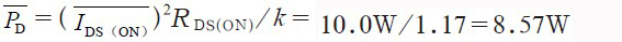 (3)若考慮到還有關斷損耗,從圖3中可查出PD=510mW=0.51W(UDS(OFF)=600V)。假定占空比為50%,在計算平均功耗時應將關斷損耗除以2。因此PD=9.72W+0.51W/2=9.975W,該結果就與10.0W非常接近。