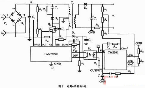 圖中C1上的電壓為經(jīng)過橋式整流后的電壓,Rs1采樣流過MOS管的電流,進行逐周期限電流控制,使MOS管的電流峰值不至于太大,確保負載短路時變壓器不發(fā)生磁飽和。利用輔助繞組完成變壓器一次繞組的電流過零檢測(APFC變壓器去磁),控制功率開關管Q2重新開始下一個開關導通工作周期的工作,F(xiàn)AN7527B的Idet引腳外接的電阻R4阻值在幾十千歐的范圍內(nèi),使電路工作于“準零電壓導通”的工作方式。R4電阻值取值和變壓器的一次繞組的電感量和功率開關管MOSFET的輸出電容有關,具體電阻值可以通過實驗來確定,本電路中取值為33K。Rs2采樣負載LED電流信號,R7、R8構成分壓網(wǎng)絡對LED上的電壓進行采樣。Rs2采樣LED上的電流與TM101上的基準信號CVin進行比較,經(jīng)誤差經(jīng)放大器對輸出進行恒流控制,LED的亮度和流過LED的電流大小基本成正比的,只要控制流過LED的電流大小就可以調(diào)節(jié)LED的亮度。R7、R8采樣LED上的電壓與TM101上的基準信號CVin進行比較,經(jīng)誤差放大器對輸出電壓控制,送入TM101的這兩路信號相“與”后通過光耦送入控制芯片F(xiàn)AN75 27B的誤差放大器進入乘法器。乘法器另一路是通過R13、R19、R23和R27采樣經(jīng)全波整流后的市電信號,這兩路信號的乘積就是乘法器輸出,該輸出信號使得電感電流跟蹤乘法器的輸出波形信號,產(chǎn)生的PWM脈沖控制MOS管Q1的開關,實現(xiàn)對負載電流和輸入電流的控制,完成LED實現(xiàn)對LED的恒流限壓控制和輸入功率因數(shù)的校正。