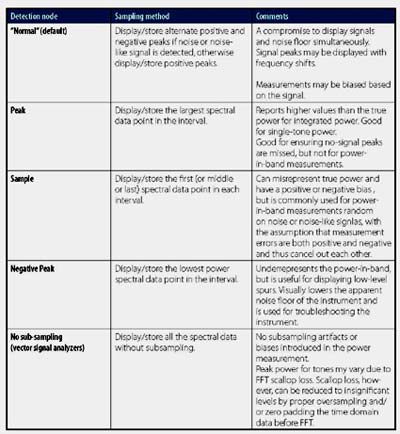 檢測模式是另一種幅度控制方式,可用于傳統(tǒng)的掃描頻譜分析儀,但不能用于基于FFT的分析儀??煞譃槠胀?、峰值、采樣或負(fù)峰值等模式,具體檢測模式?jīng)Q定了頻譜分析儀如何減少頻譜信息的,或者說如何壓縮頻譜信息。