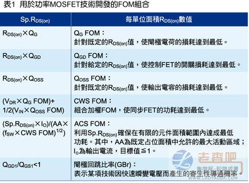 為使DC-DC轉(zhuǎn)換中采用的MOSFET技術(shù)達(dá)成最佳化,首先須確定對(duì)目標(biāo)應(yīng)用的性能造成影響的關(guān)鍵元件參數(shù)為何。透過(guò)功耗機(jī)制分析得出的這些參數(shù)通常為一組關(guān)鍵效益因數(shù)(性能指標(biāo)),在確認(rèn)任何效益因數(shù)的有效性為實(shí)際限值(如可用尺寸和成本)時(shí),功耗分析所采用的假設(shè)前提相當(dāng)重要。表1列出了用于新的功率MOSFET技術(shù)研發(fā)的FOM。
