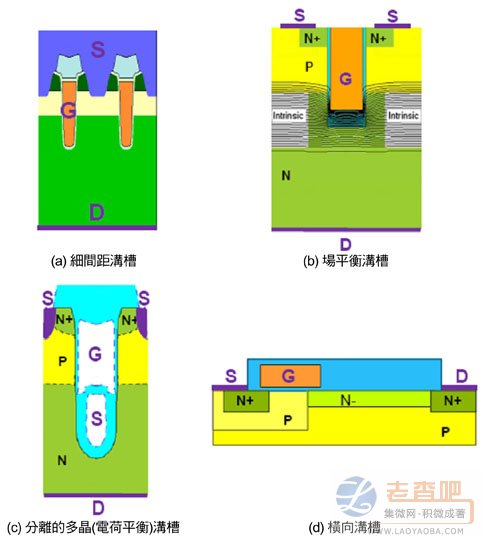 圖1標(biāo)示出目前常用的多種功率MOSFET元件結(jié)構(gòu)。圖1a中所示的高密度溝槽結(jié)構(gòu)采用較低的Sp.RDS(on),但QG和QGD較高,因?yàn)榇藘蓚€(gè)參數(shù)與單元密度成正比。此種結(jié)構(gòu)通常用于開關(guān)損耗較無(wú)重要性的應(yīng)用中(如電池保護(hù))??赏高^(guò)加大單元間距、于溝槽底部加上厚氧化膜以改善此結(jié)構(gòu)的開關(guān)性能。