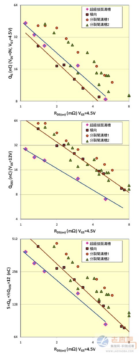 選擇功率MOSFET結(jié)構(gòu)的重要因素,在于考量該結(jié)構(gòu)是否有助于提高元件性能。若選用橫向或分裂閘結(jié)構(gòu),須考慮在低側(cè)元件應(yīng)用中,是否值得為獲得低QGD和QG而犧牲QOSS性能。這些達(dá)成最佳化的結(jié)果如圖3下半部分所示,QOSS和QG使用5伏特閘極驅(qū)動(dòng)電壓和12伏特轉(zhuǎn)換電壓進(jìn)行組合。顯然對(duì)于同步FET而言,超級(jí)接面結(jié)構(gòu)因其固有的低QOSS而具備最佳的綜合性能。此結(jié)果表明,僅藉由達(dá)成最佳化已不足以獲得最低QG和QGD FOM。這種情況更足以證明,溝槽結(jié)構(gòu)中閘極電荷已降至相當(dāng)?shù)?,QG不再扮演低側(cè)元件開關(guān)損耗的主要因素。