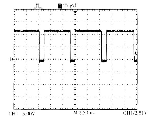 通過示波器采樣肖特基二極管兩端的波形,同樣以3 顆LED 負載為例進行采樣。