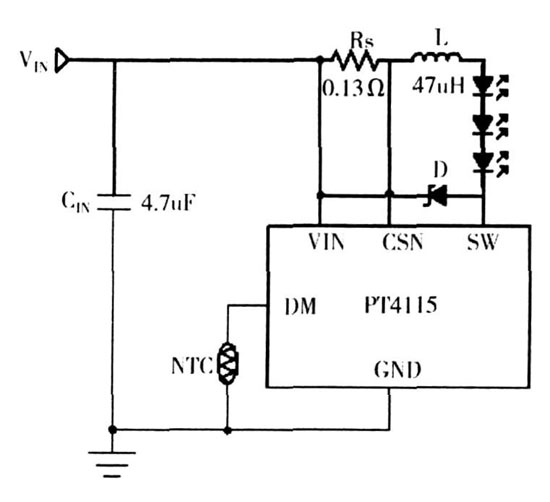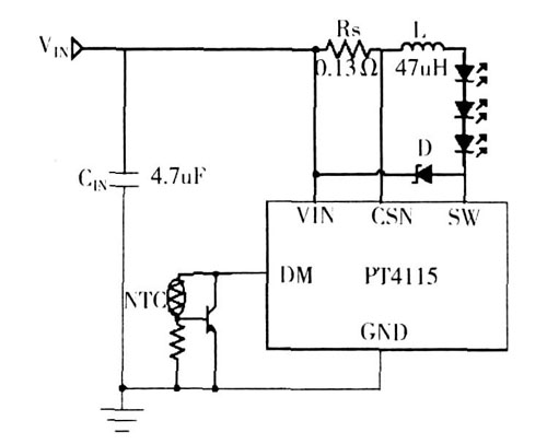 4) PT4115 內部自帶過溫保護功能,外部過溫保護可設,對LED 實現(xiàn)雙重保護;