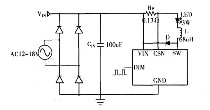 對于PT4115 (見圖4) 即可以應用于12~18 V 的交流,也可應用在8 V~30 V 的直流。因此,應用范圍更加廣泛。并且,驅動電路簡單,所需元器件均價格低廉。適合批量、市場化。