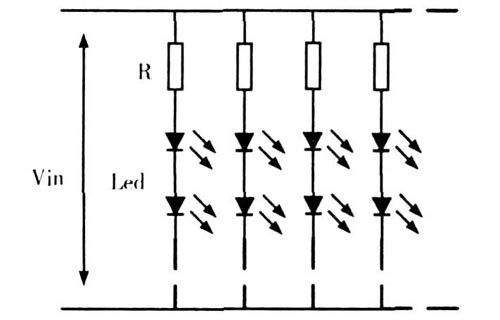 從圖2 中可見,采用電阻鎮(zhèn)流的驅動方式就是在LED 燈串上串聯(lián)上鎮(zhèn)流電阻。通過鎮(zhèn)流電阻降低在LED 燈串上的電壓,防止LED 過壓被擊穿。鎮(zhèn)流電阻的驅動方式實際上就是通常所說的恒壓驅動方式。該種驅動方式雖然簡單,但是在鎮(zhèn)流電阻上會有損耗,并且,損耗會隨輸入電壓的增大而增大。因此,該種技術作為最早的驅動技術,已經(jīng)隨著技術的發(fā)展,逐漸被取代。
