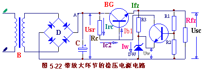 輸出電壓的變化量△Usc 是很微弱的,它對(duì)調(diào)整管的控制作用也很弱,因此穩(wěn)壓效果不夠好,帶有放大環(huán)節(jié)的穩(wěn)壓電源,就是在電路中增加一個(gè)直流放大器,把微弱的輸出電壓變化量先加以放大,再去控制調(diào)整管,從而提高對(duì)調(diào)整管的控制作用,使穩(wěn)壓電源的穩(wěn)定性能得到改善。圖5-22 是帶有放大環(huán)節(jié)的穩(wěn)壓電源電路。