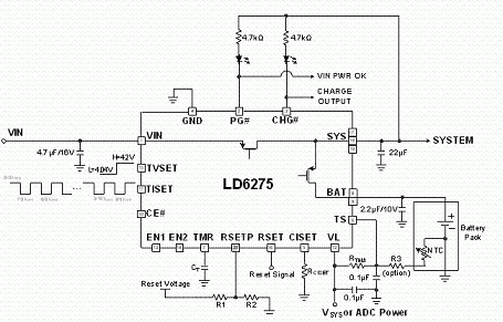 為滿足低耗電可攜式產(chǎn)品對(duì)于更精確、更安全的充電器應(yīng)用需求,許多IC制造商發(fā)展出低成本線性充電器。圖2是以通嘉科技的LD6275充電IC為設(shè)計(jì)范例,構(gòu)成僅需少數(shù)外部零件的獨(dú)立式線性充電器電路,其具備1.5A的最大充電電流。