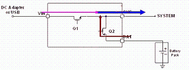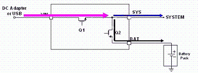 LD6275 具有適應(yīng)性電源路徑管理(Adaptable Power Path Management, APPM)功能,其為以供給系統(tǒng)端用電為主,對(duì)電池充電為輔,如圖3所示;當(dāng)系統(tǒng)用電超過輸入電源的供給限制時(shí),其電池亦能主動(dòng)開啟放電功能同時(shí)對(duì)系統(tǒng)端供給其所需之電能需求,如圖4所示。