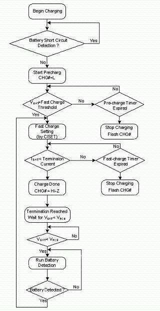 圖6所示為鋰離子電池充電器的標(biāo)準(zhǔn)充電流程,首先充電IC偵測(cè)是否有輸出短路或是過載的保護(hù)模式,若系統(tǒng)一切正常接著偵測(cè)電池初始電壓是否達(dá)到 3V以上,高于3V者就直接以快充模式進(jìn)行高電流充電,若電池低于3V者,進(jìn)入預(yù)充電模式,以快充的10%進(jìn)行充電,喚醒電池并避免電池?fù)p壞。在預(yù)充電階段,仍隨時(shí)偵測(cè)電池電壓,達(dá)到3V后可隨即切入快充模式。