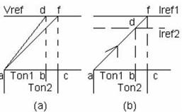 傳統(tǒng)的開(kāi)關(guān)電源控制電路中,電流極限比較器結(jié)構(gòu)如圖1(a)所示,檢測(cè)電流由M1(senseMOSFET)流入由多個(gè)開(kāi)關(guān)管和電阻組成的網(wǎng)絡(luò)R1中,該網(wǎng)絡(luò)通過(guò)控制開(kāi)關(guān)管導(dǎo)通或關(guān)斷,改變R1的電阻值,得到不同的占空比。另外一基準(zhǔn)電流流過(guò)一阻值固定的電阻R,產(chǎn)生一固定參考電壓。當(dāng)R1的壓降隨檢測(cè)電流上升到參考電壓時(shí),比較器關(guān)斷功率管,保證輸出電壓穩(wěn)定。其工作原理如圖2(a)所示,例如:R1上的電壓從a上升到d,從而關(guān)斷功率管產(chǎn)生一占空比,當(dāng)改變R1的電阻值,R1上的電壓從a上升到f得到另一占空比。從圖1(a)可以看出:傳統(tǒng)的開(kāi)關(guān)電源電流極限比較器是將兩種電流先轉(zhuǎn)化成電壓再進(jìn)行比較,需要占芯片面積非常大的電阻網(wǎng)絡(luò)和開(kāi)關(guān)管,并且為保證電阻精度,一般需要激光修調(diào)技術(shù),這大大增加了芯片成本。因此本文在此基礎(chǔ)上提出一種新型的電流極限比較器結(jié)構(gòu)。