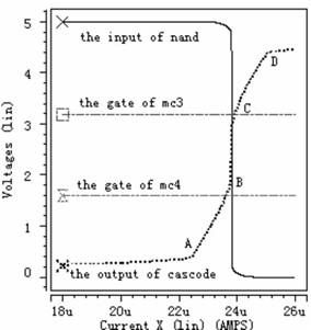 從虛線即cascode結(jié)構(gòu)的輸出電壓波形可以看出,電流極限比較器的工作過(guò)程分為五個(gè)階段,第一階段:檢測(cè)電流從0慢慢上升到A,在此過(guò)程中,由于檢測(cè)電流遠(yuǎn)小于極限電流,強(qiáng)迫Mc3和Mc4都工作于線性區(qū)。第二階段:檢測(cè)電流從A上升到B,cascode結(jié)構(gòu)的輸出電壓也隨著上升,使Mc4工作于飽和區(qū),Mc3工作于線性區(qū)。但是Mc4只是剛剛進(jìn)入飽和區(qū),還受溝道調(diào)制因素影響,這可從圖中很清析地看出當(dāng)cascode結(jié)構(gòu)的輸出電壓隨檢測(cè)電流上升時(shí),Mc4中電流慢慢接近所設(shè)定的極限電流。第三階段:檢測(cè)電流從B上升到C,此時(shí)檢測(cè)電流已上升到所設(shè)定的極限電流,Mc3和Mc4都工作于飽和區(qū),同時(shí)cascode結(jié)構(gòu)的輸出電壓也上升到后面反相器的中點(diǎn)電壓,經(jīng)過(guò)后續(xù)控制電路關(guān)斷功率管。第四階段:檢測(cè)電流從C上升到D,此時(shí)檢測(cè)電流大于所設(shè)定的極限電流,迫使Mc5工作于線性區(qū),雖Mc6還工作于飽和區(qū),但受溝道調(diào)制因素影響,另外Mc3和Mc4工作于飽和區(qū)。第五階段:檢測(cè)電流從D繼續(xù)往上升,迫使Mc5和Mc6都工作于線性區(qū),Mc3和Mc4工作于飽和區(qū)。從圖4中可以看出,當(dāng)檢測(cè)電流達(dá)到4.1μA時(shí),關(guān)斷功率管,滿(mǎn)足系統(tǒng)要求。圖5--圖7的工作情況與圖4類(lèi)似,圖5設(shè)定極限電流為16μA,可以看出當(dāng)檢測(cè)電流達(dá)到15.97μA時(shí),關(guān)斷功率管。圖6設(shè)定極限電流為24μA,可以看出當(dāng)檢測(cè)電流達(dá)到23.82μA時(shí),關(guān)斷功率管。圖7設(shè)定極限電流為40μA,可以看出當(dāng)檢測(cè)電流達(dá)到39.6μA時(shí),關(guān)斷功率管。