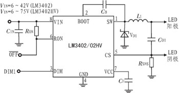 高亮度白光二極管一般采用恒流電源驅(qū)動(dòng)。因?yàn)殡S著LED逐漸變熱,其電壓降將減小,而且若LED串由恒壓電源供電的話,電源往往會(huì)持續(xù)提供過多的電流,使輸出電壓增大,直到電源達(dá)到電流限值或LED失效。脈寬調(diào)制方式是用較高的頻率開關(guān)LED,開關(guān)頻率超出人一般能夠察覺的范圍,給人一種LED總亮的假象,現(xiàn)在普遍采用脈寬調(diào)制方式調(diào)節(jié)LED的亮度,在某些應(yīng)用中,調(diào)光比可達(dá)5 000:1,常用的LED驅(qū)動(dòng)有降壓型(Buck)、升壓型(Boost)、升降壓型(Buck~Boost)等3種。LM3402是一款由可控電流源衍生的降壓型穩(wěn)壓器,輸入電壓范圍涵蓋整個(gè)汽車應(yīng)用領(lǐng)域,內(nèi)置MOS管最多可以驅(qū)動(dòng)5顆LED,性價(jià)比高,且接受領(lǐng)域較廣、線路簡(jiǎn)潔實(shí)用,是眾多LED驅(qū)動(dòng)IC中間的佼佼者。