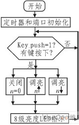 控制器程序根據(jù)3個(gè)按鈕的輸入狀態(tài),實(shí)現(xiàn)開關(guān)或亮度調(diào)節(jié),并將亮度狀態(tài)在4個(gè)指示燈上顯示出來。利用微處理器自身集成的EEPROM單元,可隨時(shí)保存亮度狀態(tài)n(PWM占空比)。主程序流程框圖如圖3所示。