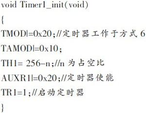 微處理器P89LPC932內(nèi)部定時(shí)器TO/T1的PWM輸出與計(jì)數(shù)輸入和定時(shí)器觸發(fā)輸出占用相同的管腳,發(fā)生定時(shí)器溢出時(shí)自動(dòng)觸發(fā)端口輸出。此功能通過AUXR1寄存器中的控制位ENT0和ENT1分別使能定時(shí)器0和1。該模式打開時(shí),在首次定時(shí)器溢出前端口的輸出為邏輯1。為了使該模式生效,必須清零C/T位以選擇PCLK作為定時(shí)器的時(shí)鐘源。定時(shí)器初始化設(shè)置參考程序如下: