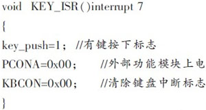 經(jīng)檢測(cè),在同等照度要求的情況下,采用LED調(diào)光控制系統(tǒng)的功耗較白熾燈降低90%以上,當(dāng)然為進(jìn)一步降低能耗,節(jié)能方法的探究仍然具有十分重要的意義。在多數(shù)時(shí)間,HBLEDs可能處于熄滅狀態(tài),若控制系統(tǒng)處于待機(jī)狀態(tài)或掉電狀態(tài),可將功耗降低到最低;或?qū)FF端口接地,也可將LM3402置于一個(gè)極低的低功率關(guān)機(jī)狀態(tài)。將微處理器P89LPC932的電源控制寄存器PCONA設(shè)置為0xFF時(shí),外部功能模塊掉電;將電源控制寄存器PCON設(shè)置為03H時(shí),可將微處理器處于完全掉電狀態(tài),只有在中斷觸發(fā)的時(shí)候,才能喚醒,隨即給外部功能模塊上電,微處理器開始工作。微處理器主要通過鍵盤中斷喚醒,鍵盤中斷參考程序如下: