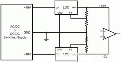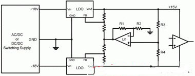 圖2顯示了一個(gè)典型運(yùn)算放大器電源電路的示意圖。此處,一個(gè)開關(guān)電源提供一個(gè)正18V和一個(gè)負(fù)18V。兩低壓降(LDO)線性穩(wěn)壓器進(jìn)一步將±18V調(diào)節(jié)至±15V。該LDO一般安裝在電源和運(yùn)算放大器之間,旨在降低開關(guān)電源產(chǎn)生的高頻開關(guān)噪聲。LDO具有較高的電源抑制(以比率表示,PSRR),其減弱了寬帶頻率下LDO輸入的噪聲。