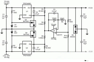 圖5所示電路使用一個(gè)如TPS7A3001等可調(diào)節(jié)、負(fù)輸出電壓LDO線性穩(wěn)壓器,以及如TPS7A4901等可調(diào)節(jié)、正輸出電壓LDO。U3、R7-R10和C3均為增加的組件,用于追蹤。R1、R2、D1-D5均為增加組件,用于將反饋引腳的電壓控制在其各自產(chǎn)品說(shuō)明書額定的絕對(duì)最大電壓范圍內(nèi)。