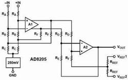 AD8205的內(nèi)部電路由A1和A2兩個集成運放和一個電阻網(wǎng)絡(luò),以及一個小參考電壓源和偏置電路構(gòu)成,其電路結(jié)構(gòu)如圖1所示。
