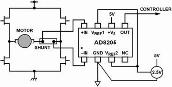 如圖5所示連接,AD8205在H橋馬達(dá)控制電路中作為控制回路的一部分,馬達(dá)和采樣電阻串連后放置在H橋的中間,通過檢測采樣電阻上的電壓,可以準(zhǔn)確地測量馬達(dá)當(dāng)前的電流及其方向。此時,AD8205的輸出被設(shè)定成外部參考雙向的方式,這樣它可以測量H橋開關(guān)的雙向電流并同時監(jiān)測馬達(dá)的運轉(zhuǎn)方向。由于地不是一個特別穩(wěn)定的參考電平,以地為參考將會導(dǎo)致測量的不準(zhǔn)確性。因此,這種測試方案要比以地作為參考電平的測試方法好的多。