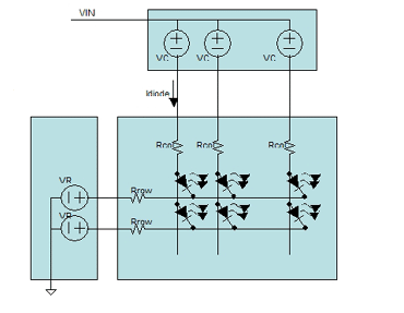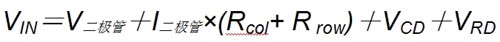 其中:V二極管是二極管的前向壓降;I二極管是流經(jīng)二極管的電流;Rcol是列連接的電阻;Rrow是行金屬的電阻;VCD是列驅(qū)動(dòng)器所需的開(kāi)銷;VRD是行驅(qū)動(dòng)器所需的開(kāi)銷;在典型應(yīng)用中,VIN大約為20V。