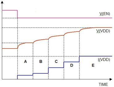 在A部分,通過(guò)限制流過(guò)分?jǐn)嚅_(kāi)關(guān)的電流來(lái)減少負(fù)載電容充電時(shí)的浪涌電流;在B部分,升壓轉(zhuǎn)換器的開(kāi)始電流限制在25%;在C部分,電流限制設(shè)在50%;在D部分電流限制為75%;在E部分,電流限制為100%。