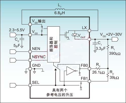 如上所述,當(dāng)OLED工作在暗的模式時(shí)可以通過(guò)降低輸出電壓顯著地節(jié)省功耗。因此為OLED電源選擇的最佳電源芯片應(yīng)包含能夠提供這一功能的電路。采用兩條獨(dú)立的反饋路徑就可實(shí)現(xiàn)這一功能,而且這兩條反饋路徑可以通過(guò)簡(jiǎn)單的邏輯輸入進(jìn)行選擇。因此通過(guò)這種方法就可簡(jiǎn)單地實(shí)現(xiàn)PMOLED中使用的亮→暗→關(guān)節(jié)電技術(shù)。