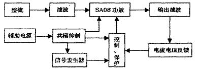 單相220V AC電壓一路經(jīng)整流橋整流濾波后作為SA08的功率電源;另一路經(jīng)AC/DC轉(zhuǎn)換、共模抑制后作為控制電路和SA08輔助電源;信號發(fā)生器產(chǎn)生頻率400Hz;幅度可調(diào)的正弦信號;信號發(fā)生器通過優(yōu)化電路設(shè)計和選用低溫漂元件實現(xiàn)輸出頻率的穩(wěn)定;控制電路對輸入指令信號進行偏置、放大、PID及濾波處理、輸出限幅等;最后作為SA08輸入信號控制其功率輸出。過壓保護和過流保護也通過控制電路實現(xiàn);SA08輸出的高頻高壓SPWM波經(jīng)LC濾波器后供給負(fù)載;反饋電路直接從負(fù)載上進行電壓電流取樣;確保控制的精度。