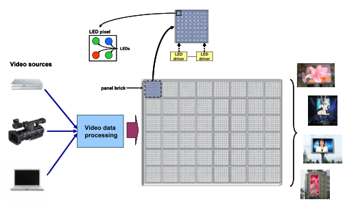 整個(gè)顯示屏通常由若干個(gè)正方形或矩形的點(diǎn)陣組成,每個(gè)點(diǎn)陣又由若干個(gè)像素組成。每個(gè)像素由RGB (紅、綠、藍(lán))LED燈管組成,通過(guò)混合這些LED的燈光顏色,就可產(chǎn)生所需的像素信息。LED驅(qū)動(dòng)器相當(dāng)于被處理后的視頻數(shù)據(jù)與RGB LED發(fā)出的彩色燈光之間的接口(圖像就是由這些彩色光線構(gòu)成的)。
