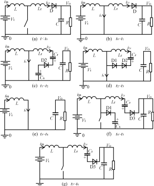 圖2新型無源無損軟開關Boost變換器的工作模態(tài)