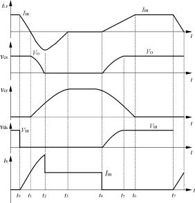 從t5開始,vcs被鉗在VO,即VCsmax=VO;電源繼續(xù)經(jīng)L,Lr,Cr,D3向負載供電,電容Cr繼續(xù)放電。t=t6時,電容電壓vcr降到零,同時電感電流iLr上升到Iin,iLr=Iin,簡化電路如圖2(g)所示,波形圖如圖3所示。