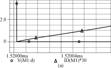 由圖4可知,當開關導通時,開關電壓V(M1:d)(Vds)下降,由于電感Lr的作用,電流不能突變,使得開關電流is在開關電壓V(M1:d)(Vds)降到零后,才從零開始上升,實現(xiàn)了開關的零電流導通。當開關關斷時,由于電容Cs的鉗壓作用,開關電壓從低電壓上升,基本實現(xiàn)零電壓關斷。而電感電流iLr和電壓vcr波形與理論分析的是一致的。