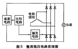 設(shè)計的釹鐵硼永磁發(fā)電裝置結(jié)構(gòu)示意圖如圖4所示,還研制了三相半控橋整流穩(wěn)壓電路(圖5)。該電路由三相半控橋整流電路、電壓信號取樣電路和觸發(fā)電路組成。當(dāng)發(fā)電機輸出電壓低于目標(biāo)穩(wěn)壓值時,電子穩(wěn)壓器為三相整流輸出。當(dāng)發(fā)電機輸出電壓高于目標(biāo)穩(wěn)壓值時,電壓信號取樣電路自動使三相半控橋整流電路瞬時斷開,降低輸出電醫(yī)當(dāng)發(fā)電機輸出電壓再低于目標(biāo)穩(wěn)壓值時,三相半控橋整流電路再恢復(fù)工作,周而復(fù)始。通過整流、斬波,保證了發(fā)電機輸出電壓穩(wěn)定的直流電。