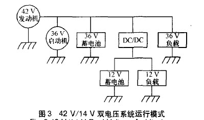 雙電壓系統(tǒng)將汽車電器與電控裝置根據(jù)耗電量的大小分為兩組,傳統(tǒng)的中小功率用電器為一組,如燈具、儀表、電動雨刷等采用14V電源供電;而大功率用電器如發(fā)動機控制單元、加熱、電動懸架等電器則直接采用42V的電源供電。交流發(fā)電機經(jīng)整流調(diào)壓后得到42V電壓供給高功率負(fù)載并對36V蓄電池充電,而42V電壓經(jīng)DC/DC變換器之后為14V電氣系統(tǒng)供電。