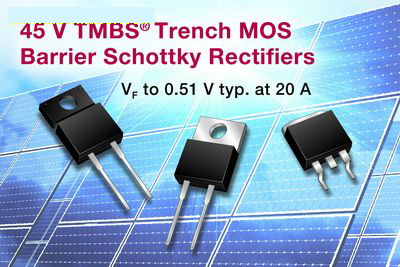 Vishay發(fā)布12個采用不同封裝的45V TMBS® TrenchMOS勢壘肖特基整流器器件可用于光伏太陽能電池旁路保護(hù),具有10A~40A的寬額定電流范圍,在20A電流下的典型VF低至0.51V。