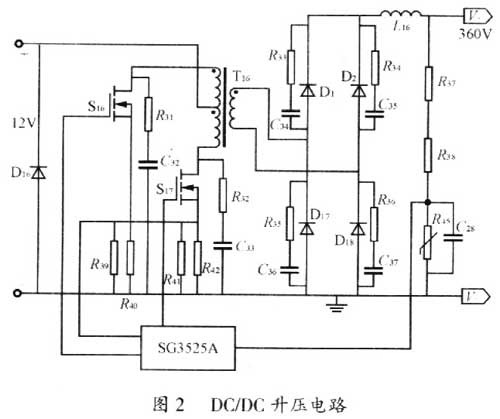 其工作原理為將升壓變壓器的中心抽頭接于正電源,兩路相反的PWM驅(qū)動脈沖送至開關(guān)管S16、S17的基極,從而控制兩只功率管交替工作,得到的方波交流電壓經(jīng)變壓器輸出,經(jīng)電感L16和電容濾波得到360V直流。電流檢測電阻(R41//R42)得到的電壓接到SG3525A的腳10來實現(xiàn)過流保護(hù)。R37、R38和R45為電壓采樣,構(gòu)成電壓負(fù)反饋,因而提高了電路的可靠性。SG3525A及控制電路的電源都來自蓄電池,D16為防反接二極管。DC/DC從12V蓄電池電壓升到360V直流電,供后級鎮(zhèn)流電路點燈。