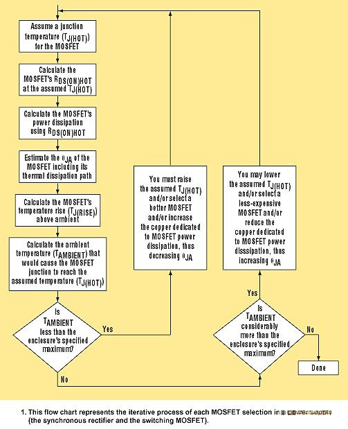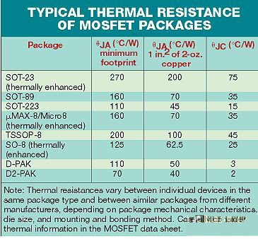 再參考圖1說明,確定是否正確選擇了用于同步整流器和開關(guān)MOSFET的MOSFET迭代過程的下一個步驟。這一步驟計算每個MOSFET的環(huán)境空氣溫度,它可能導(dǎo)致達(dá)到假設(shè)的MOSFET結(jié)溫。為此,首先要確定每個MOSFET的結(jié)與環(huán)境間的熱阻(ΘJA)。