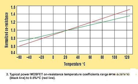 對于開關(guān)MOSFET和同步整流器兩者,都是選擇作為此迭代過程開始點的最大允許裸片結(jié)溫(TJ(HOT))。大多數(shù)MOSFET數(shù)據(jù)參數(shù)頁只給出25°C的最大RDS(ON),,但近來有一些也提供了125°C的最大值。MOSFETRDS(ON)隨著溫度而提高,通常溫度系數(shù)在0.35%/°C至0.5%/°C的范圍內(nèi)(圖2)。如果對此有所懷疑,可以采用更悲觀的溫度系數(shù)和MOSFET在25°C規(guī)格參數(shù)(或125°C的規(guī)格參數(shù),如果有提供的話)計算所選擇的TJ(HOT)處的最大RDS(ON):RDS(ON) HOT =RDS(ON) SPEC ×[1+0.005×(TJ(HOT)?TSPEC)]