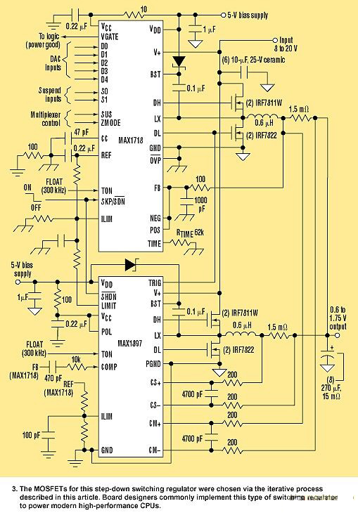 圖3所示CPU內(nèi)核電源在40A提供1.3V。兩個同樣的20A電源在300kHz運(yùn)行,提供40A輸出電源。MAX1718主控制器驅(qū)動一個,而MAX1897從控制器驅(qū)動另一個。該電源輸入范圍在8~20V之間,指定封裝的最高工組作環(huán)境溫度60°C。