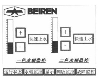在人機界面中,設計了7幅畫面,包括整體圖形,故障顯示,機器速度和計數(shù)顯示,水輥速度顯示,調版監(jiān)控等。故障顯示使用指示器,給出位元件即可實現(xiàn)閃動效果,讓操作者很方便的知道故障部位,整體感很好。在水輥速度顯示中,設計了一個柱狀圖,可以顯示水量增加大小,只需按下柱狀圖,就可增加水量,同時也可方便監(jiān)控。如圖所示: