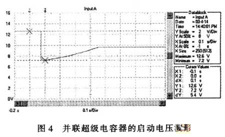 蓄電池是汽車中的關(guān)鍵電器部件,其性能直接影響汽車的啟動。現(xiàn)在的汽車啟動無一例外地采用啟動電動機啟動方式。在啟動過程中特別是在啟動瞬間,由于啟動電動機轉(zhuǎn)速為零,不產(chǎn)生感生電勢,故啟動電流:I=E/(RM+RS+RL);其中:E為蓄電池空載端電壓,RM為啟動電動機的電樞電阻,RS為蓄電池內(nèi)阻、RL為線路電阻。由于RM、RB、RL均非常低,啟動電流非常大。例如用12V、45Ah的蓄電池啟動安裝1.9L柴油機的汽車,蓄電池的電壓在啟動瞬間由12.6V降到約3.6V,啟動過程的蓄電池電壓波形如圖1所示。啟動瞬時的電流達550A,約為蓄電池的12C的放電率>啟動過程的蓄電池電流波形如圖2所示。電流傳感器的電流/電壓變換比率為100A/V。盡管車用蓄電池是啟動專用蓄電池,可以高倍率放電,但從圖l可以看出,10倍以上高倍率放電時的蓄電池性能變得很差,而且,如此高倍率放電對蓄電池的損傷也是非常明顯的。啟動過程的電壓劇烈變化也是極強的電磁干擾,可以造成電氣設(shè)備掉電,迫使電氣設(shè)備在發(fā)電機啟動過程結(jié)束后重新上電,計算機在這個過程中非常容易死機。因此,從改善汽車電氣設(shè)備的電磁環(huán)境、改善汽車的啟動性能和蓄電池性能或延長蓄電池使用壽命來考慮,改善汽車電源在啟動過程中的性能是必要的。解決問題的方案之一是加大蓄電池的容量,但需要增加很多,并使其體積增大,這并不是好的選擇。而將超級電容器與蓄電池并聯(lián)可以很好地解決這個問題。