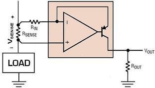 為了克服這些電流檢測(cè)難題,人們創(chuàng)造了高端電流檢測(cè)放大器。這些特殊放大器用來從高共模電壓中抽取通過小檢測(cè)電阻的電流產(chǎn)生的小差分電壓。然后,檢測(cè)電壓被放大并被轉(zhuǎn)換成以地為基準(zhǔn)的信號(hào)。圖 5 顯示了高端電流檢測(cè)放大器的基本拓?fù)?。在這個(gè)圖中,放大器給 RIN 加上等于 VSENSE 的電壓。然后,通過 RIN 的電流流過 ROUT,提供以地為基準(zhǔn)的輸出電壓。就這個(gè)基本功能而言,很明顯,高端電流檢測(cè)放大器應(yīng)該有高輸入阻抗、高增益和高增益準(zhǔn)確度、以及寬共模范圍和良好的共模抑制。也許不那么明顯的是還有放大器精確度的重要性。
