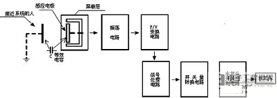 系統(tǒng)組成框圖如圖3所示,從框圖可以看出控制信號(hào)的流程:當(dāng)人或其它物體接近電容式接近開(kāi)關(guān)時(shí),等效電容的容量值會(huì)發(fā)生變化,從而改變LC振蕩器的振蕩頻率,F(xiàn)/V電路將LC振蕩器輸出的頻率量轉(zhuǎn)化成電壓量后,交給信號(hào)處理電路,該部分將電壓信號(hào)進(jìn)行一系列的處理(包括:放大、整形等)后傳給開(kāi)關(guān)量變換電路,開(kāi)關(guān)量轉(zhuǎn)換電路實(shí)際上是A/D轉(zhuǎn)換器,它將模擬電壓轉(zhuǎn)換為數(shù)字量,水龍頭控制電路由開(kāi)關(guān)量轉(zhuǎn)換電路的輸出量控制,它產(chǎn)生控制信號(hào)控制水龍頭的開(kāi)與關(guān)。本系統(tǒng)設(shè)計(jì)成當(dāng)人接近水龍頭一定距離時(shí),水龍頭自動(dòng)開(kāi)啟,離開(kāi)一定距離后水龍頭自動(dòng)關(guān)閉。