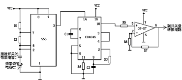 連線(xiàn)圖如圖4所示,由555定時(shí)器組成的振蕩器,它的振蕩頻率為:f=1/0.69*(R1+2*R2)*(C//CT),C就是電容式接近開(kāi)關(guān)的等效電容值,CT為頻率調(diào)節(jié)電容,通過(guò)C的變化從而使振蕩頻率變化,將此種變化傳給F/V電路,引起F/V電路的輸出電壓變化。由鎖相環(huán)CD4046組成的F/V變換電路將頻率值變成電壓值后,經(jīng)精密運(yùn)放OP-07線(xiàn)性放大后輸入到開(kāi)關(guān)量轉(zhuǎn)換器(A/D轉(zhuǎn)換器)的輸入端。