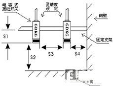 安裝要求示意圖如圖5所示,圖中S1表示檢測(cè)面與支架的間距,要求≥1Sn,S2表示檢測(cè)面與背景的間距,要求≥3Sn,S3表示并列安裝間距,要求≥5Sn,S4表示檢測(cè)面與側(cè)壁的間距,要求≥3Sn。(Sn為電容式接近開(kāi)關(guān)的標(biāo)準(zhǔn)檢測(cè)距離)