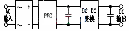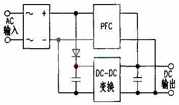 傳統(tǒng)的開關(guān)電源結(jié)構(gòu)如下圖,是將功率因數(shù)校正電路(PFC,PowerFactorCorrection)和DC-DC變換電路串聯(lián)起來(lái)。因而效率低,要減少待機(jī)功率也相當(dāng)困難。